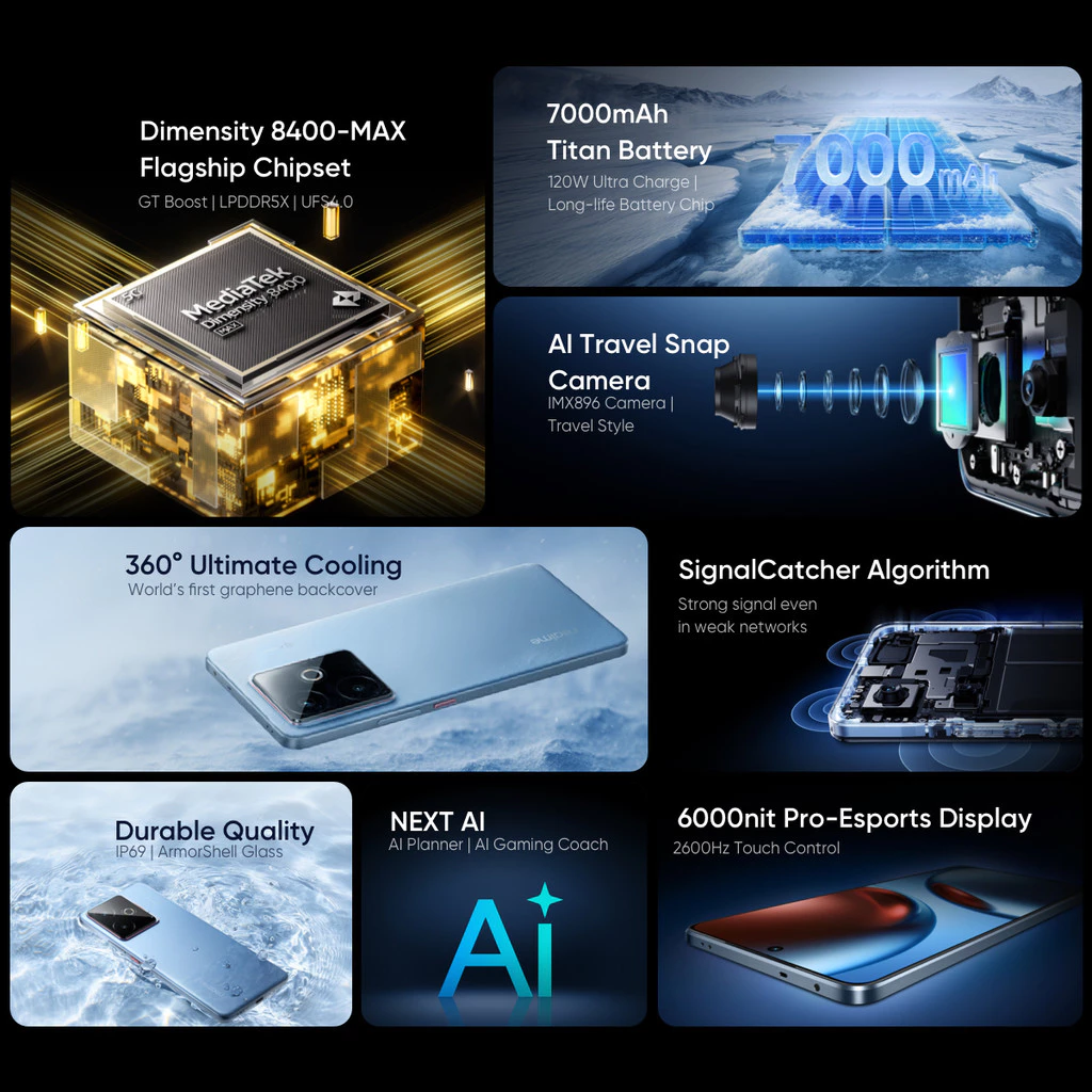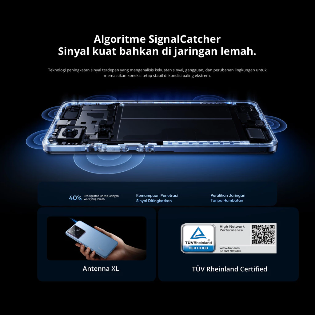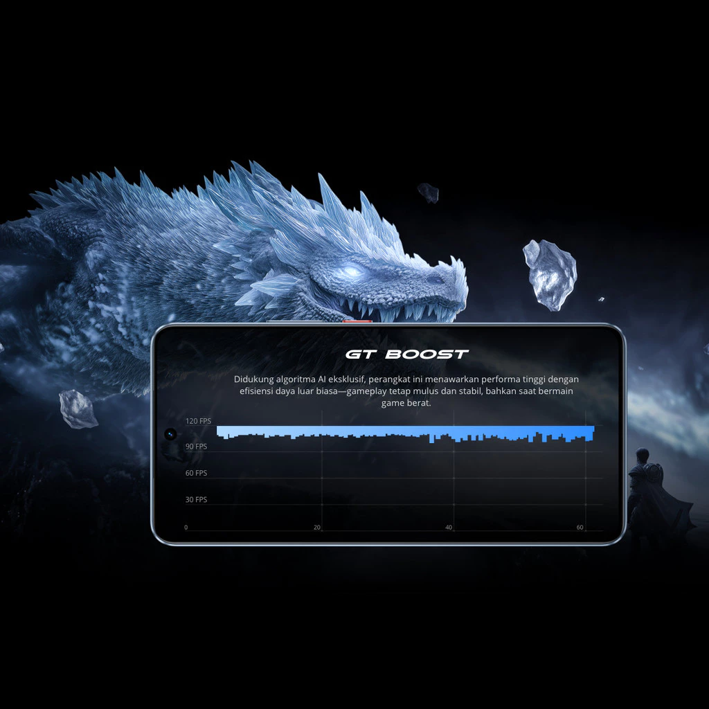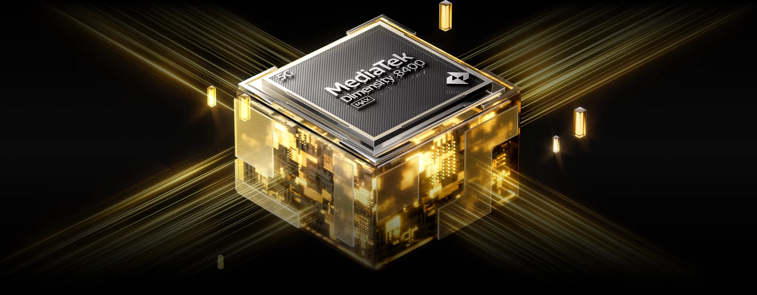 Ditenagai oleh MediaTek Dimensity 8400 Max (4nm), prosesor octa-core dengan kecepatan hingga 3,25 GHz didukung RAM LPDDR5X 12 GB dan penyimpanan UFS 4.0 256/512 GB, performa multitasking sangat lancar dan skor Antutu mencapai 1.740.000 – lebih baik dari 95% ponsel saat ini. GPU Immortalis G720 MC7 mendukung gaming berat dan kebutuhan grafis tinggi. Fitur vapour chamber 7700mm² memastikan suhu ponsel tetap stabil walau digunakan intensif