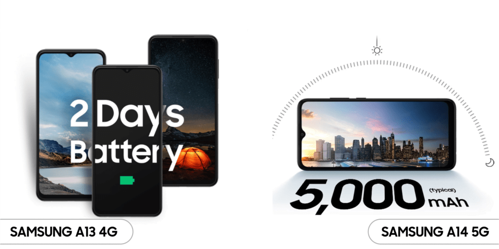 Perihal layar dari sisi ukuran keduanya sama dibekali layar super lega sebesar 6,6 inci, untuk kelancaran scrolling Samsung A13 4G hanya 60 Hz sedangkan Samsung A14 5G lebih unggul yakni 90 Hz. Samsung A13 4G sudah dibekali Corning Gorilla Glass 5 sehingga aman terkena cipratan air, debu hingga saat terjatuh.