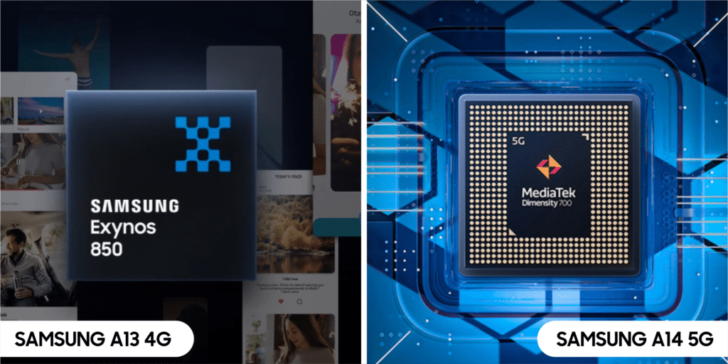 Performa kedua HP ini berbeda, A13 4G mengusung chipset Exynos 850 sedangkan A14 5G dibekali chipset yang lebih unggul yakni Mediatek Dimensity 700. Hal ini berpengaruh pada kinerja HP, tentunya kinerja Samsung A14 5G lebih cepat.