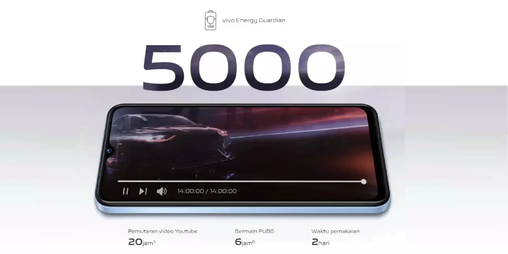 Pakai HP Vivo Y22 tidak perlu khawatir kehabisan baterai, lho. Pasalnya, HP ini sudah mengusung baterai yang tangguh hingga 12 jam pemakaian berkat kapasitas daya baterai yang tersemat sebesar 5000mAh. Nikmati bermain HP sepuasnya tanpa perlu khawatir kehabisan baterai.
